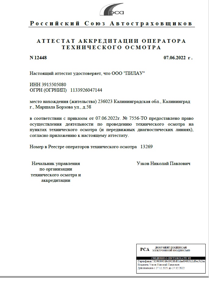 Аккредитованный оператор технического осмотра, номер в реестре 13269